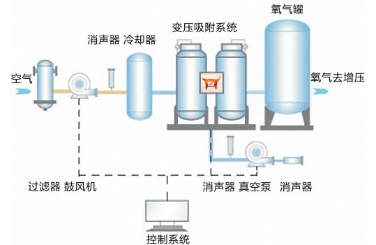 空气经过过滤器进入鼓风机,在鼓风机的输送下从吸附塔下部进入。吸附塔下部填充活性氧化铝,活性氧化铝的作用是去除空气中的水分子和二氧化碳分子,以免使沸石分子筛“中毒”。吸附塔的上部是沸石分子筛,当空气流经填满的分子筛固定床时,空气中的氮气分子在吸附作用力下扩散到分子筛固体中去,氧气分子和氩气原子则通过床层到缓冲罐中。缓冲罐与氧压机相连, 将产品压缩到用户所需的压力,送到储气罐中,供生产使用。经过一段时间的吸附,分子筛颗粒中充满氮气分子,达到吸附饱和阶段,此时关闭空气进口阀,利用塔内的富氧空气对刚抽真空的另一塔进行冲洗,等压力降到某一值时关闭均压阀,同时打开真空泵进口阀对塔体抽真空,到一定真空度后再利用另一塔内的富氧气及缓冲罐中部份产品气对沸石分子筛冲洗,从而使吸附剂彻底解吸。